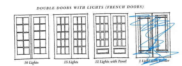 Existing window opening will be reused but made taller by extending downward (not upward); two French doors will replace the current window configuration.